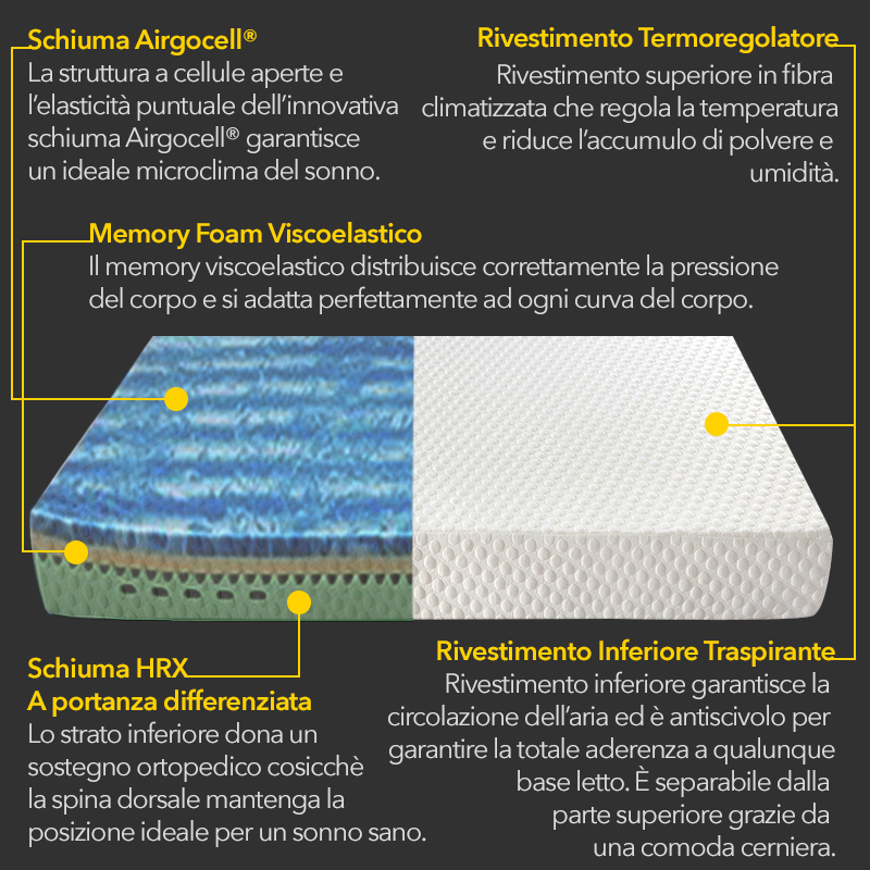 Il memory foam Soia viscoelastico distribuisce correttamente la pressione del corpo e si adatta perfettamente ad ogni curva del tuo corpo garantendo un miglior riposo.