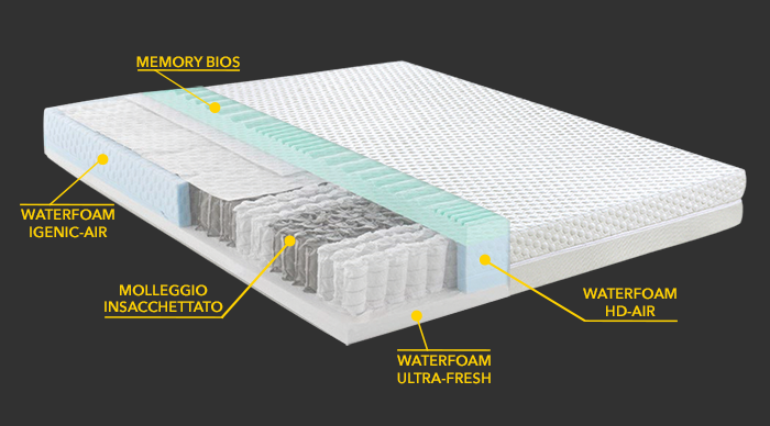 Anima interna: Lastra in box-system di Water Foam, con molleggio indipendente a nove zone differenziate di portanza con piano in memory BIOS D50 kg/m3.