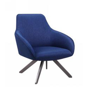 Poltrona in tessuto blu e gambe in metallo rifinita color champagne.