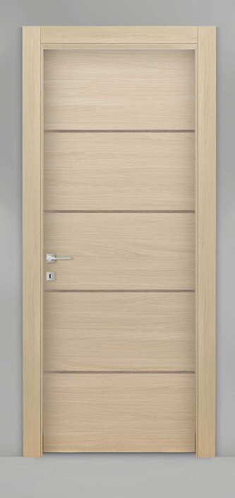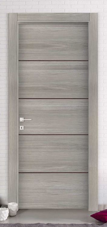 Porta liscia con possibilità di inserti orizzontali in alluminio o in finitura legno in 2 diversi colori a contrasto