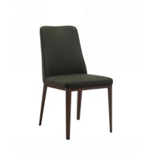 Sedia da pranzo con rivestimento in tessuto speciale e gambe in metallo rifinite di color noce.