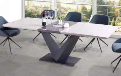 Tavolo da pranzo in MDF verniciato lucido, piano superiore dipinto grigio e gambe in metallo e fondo di color grigio scuro.